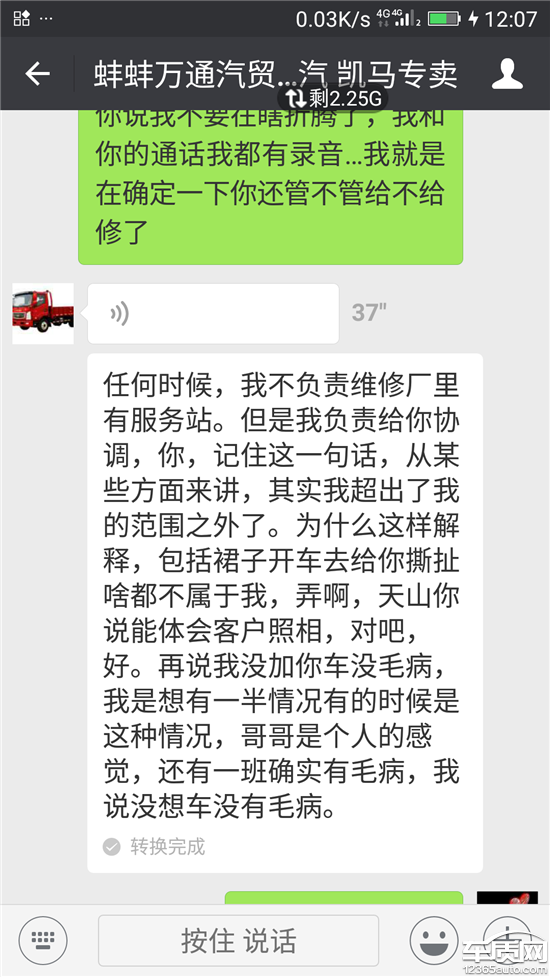 2017,12.5买唐骏T7出75码以上明显振动…看后视镜模糊。我给经销商反映。他和我这样说的车驾驶楼大,车身大有震动正常,我又打到售后服务,说共振,不管货车轿车什么车都有共振属于正常,当时我就理论,我也开了十几年车新,也开了不是一辆车都没这种情况,也没给我答复,到了第二天,售后开始给我打电话。让我开到服务站去检查一下让服务站把我前面两个轮子换到后面,结果我开了,还是那种症状,一点效果也没有,我打电话给售后,他们说可能是传动轴的原因。说给我换个传动足轴,我等了快一个月,传动轴才到。换上以后没有效果,反而到严重了。我又打电话给售后,他们说这批的传动轴质量不好。我们再重新给你发一个加重型的。我又等了十几天,没有人给我回复,我又打电话,他们说车子就是这样的,没法给你修。还是那种说法,车子每个都有共振点,从10码到100多都有可能振动,有个售后工号为608的态度非常恶劣。说车子就这样,没法给你修,我们为什么给你修,因为根本就没毛病。我把他的通话录音录下来。我说这是你说的,你会要负责任,他说对,是我说的,不管轿车,货车都有共振,就这个样子,我说的我负责。没有办法,我又打给经销商。经销商说是我个人原因,自身感觉说的话更让我生气。他们互相推卸责任,他说我只负责销售车辆,不负责维修。我只能跟你和厂家协商调解。我说你们都是这个态度。你给我调解和协商了吗?他的意思说我只负责卖车,不用找我,我说我车子在你这里买,肯定先经过你这里,我先找你。他和我说,不管你是投诉还是举报,我们都接受工商局,他说像这种情况,他说像这种情况,我们都打过官司,他们没责任。后来我又打电话给售后。售后专门给我找了个负责人,我和他说了情况,他说这个很正常,就像608工号服务人的一样,属于正常。现在他们的态度就是不给解决。