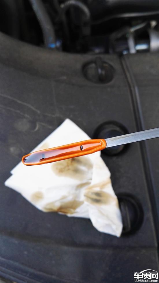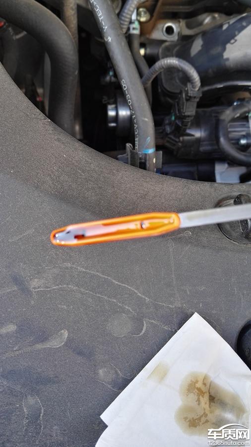 测量UR-V机油,机油液位超出标尺上限12mm左右,并且汽油味较浓。