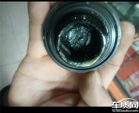 机油尺明显超过上线9毫米以上。机油盖有乳化物并伴有冰水凝固物,室外暖风明显闻到汽油味很大。机油严重发黑、