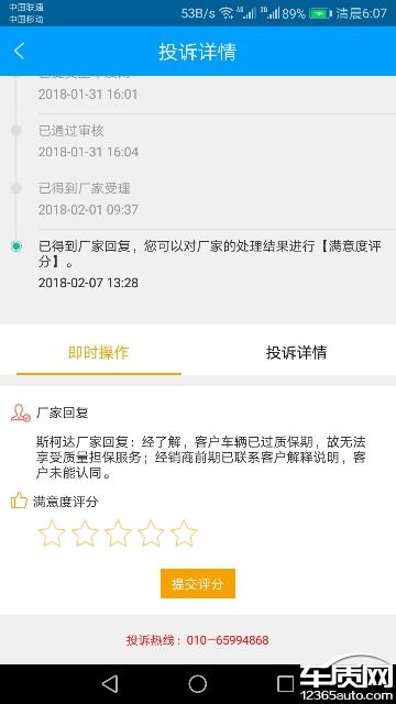 上汽斯柯达厂家回复:经了解,客户车辆已过质保期,故无法享受质量担保服务;经销商前期已联系客户解释说明,客户未能认同。