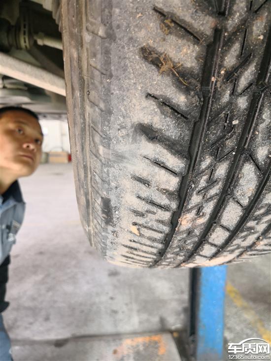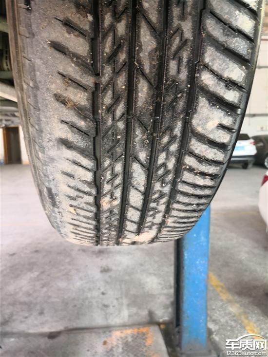 购车一年第5次在4S店保养,车身举起从底部观察车前两轮胎内侧吃胎严重,2万多公里内侧花纹已磨平,两后胎正常,且前胎有块状掉胶,4S店和厂家联系,认为不是质量问题,试问2万多公里的新车新胎磨损不能使用是否质量问题?