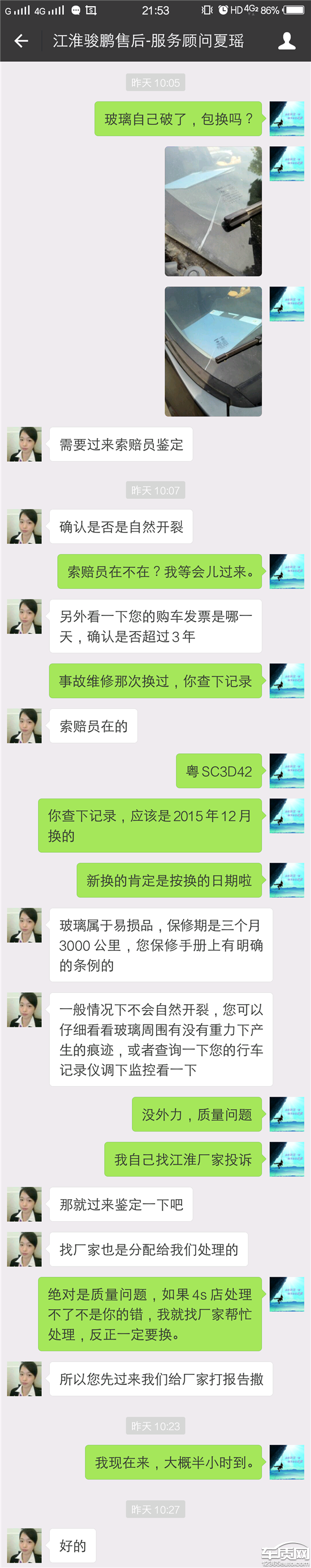 投诉江淮东莞市樟木头俊鹏汽车销售服务店:2018年4月19日上午发现前挡风玻璃出现3条自然裂纹,随即立刻联系东莞市樟木头俊鹏汽车销售服务店(以下简称4S店),购车及维修保养均在此4S店。4S店售后服务顾问(夏瑶)表示需开车前往4S店进行确认。半小时左右将车开到了4S店,店里技术工作人员确认后已过保质期为由拒绝赔付更换,原因是2015年11月左右因事故出险有更换过前挡风玻璃(平安定损后由此4S店维修)。4S店给出的理由是原车的保质期为3年,自费维修更换过的只保3个月或3000公里,故已超过保质期,确认自然损坏仍不给予赔付。投诉江淮东莞市樟木头俊鹏汽车销售服务店售后服务顾问夏瑶:2018年4月19日发现前挡风玻璃自然裂纹后,联系东莞市樟木头俊鹏汽车销售服务店(以下简称4S店)售后服务顾问(夏瑶),说明情况之后她表示已过保质期,但仍叫我开车去4S店确认(往返45公里左右),确认为自然裂纹后仍不给予赔付,既然不能处理,何必叫我浪费时间浪费油钱的去确认?确认后也并没有主动向厂家报告情况!!!投诉江淮厂家售后客服人员,工号7101:2018年4月19日上午东莞市樟木头俊鹏汽车销售服务店(以下简称4S店)告知前挡风玻璃因已过保质期,后我联系江淮厂家售后客服人员(工号7107),客服记录好我反馈的情况后说需向4S店核实情况再回复,过了一会儿4S店的找我说可以帮我走保险处理,我没同意。等客服回复迟迟没有消息,便再次拨打客服电话(4008889933),接通后另一个客服说叫7101客服回电话,后来回电话说向4S店核实了,确认此前挡风玻璃已过保质期,原车前挡风玻璃保质期3年,若有免费更换过的也随整车质保3年,自费更换的保质期以4S店规定为准。有的3个月,有的6个月,有的1年,所以,此次无法赔付,可与4S店协商走保险理赔(未购买单独玻璃破碎险)。本人质疑:4S店维修所用部件物品是否为原厂正品?质量与原车部件物品质量是否相当?为何免费更换过的或原车的前挡风玻璃质保3年,自费更换(包含保险理赔)过的前挡风玻璃质保只有短短的3个月?若4S店维修更换的部件物品是原厂正品质量相当,为何质保存在如此大的差异?江淮厂家对自己的产品这么没有信心?此质保期的规定是否合理?是否是对客户不负责任的表现?试问江淮对自己的产品和技术都没有信息,只敢保证3个月或3000公里,那么客户拿什么来信任江淮!