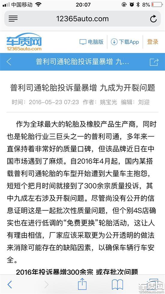 普利司通轮胎厂家回复:投诉已收到,转相关部门处理中普利司通厂家回复:「您的留言已确认。厂家会与客户联系,妥善处理。」