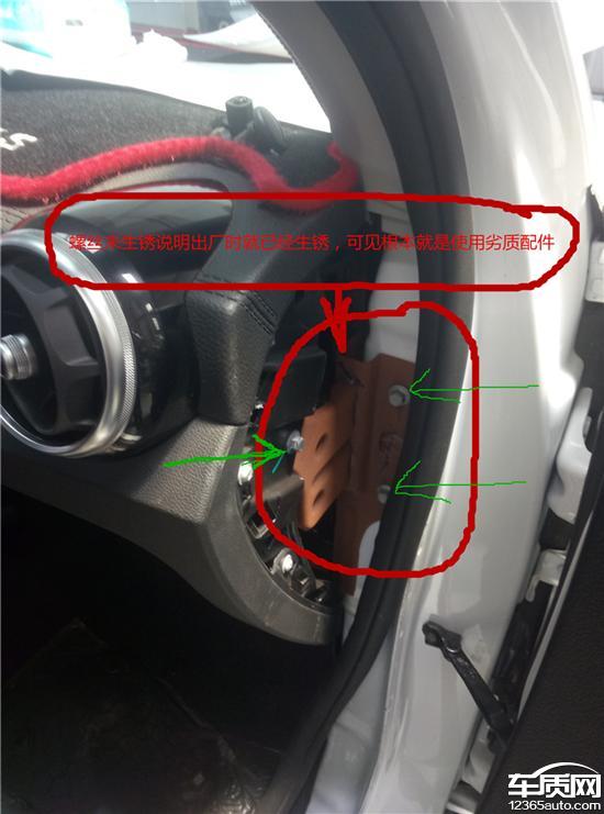 座椅铁架严重生锈(前后移动座椅时脚垫上会有许多锈斑掉落),严重影响行车安全。还有前保险杠镀铬条、前雾灯镀铬条、挡杆周围镀铬条被腐蚀出现花斑。2018年6月9号10号在4s店检查了两天也没有任何结果。问题没有得到解决而且又发现新的问题转向轴、中控支架、座椅严重生锈随时可能损坏发生危险。感觉方向盘要被拧下来一样简直是在拿生命开玩笑。前往兰州4s店需要6个多小时,8月九日说配件齐全可以更换,8月11、12号又到兰州更换,被告知要从其他车上拆卸配件更换,我不同意,所以没有更换。况且被忽悠已经有两次,厂家没有一点诚意,根本就是在敷衍了事。