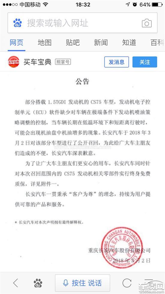 长安CS75机油增多稀释 动力不足2018-09-13车型:2017款 1.5T 手动 锋享型 尚酷版