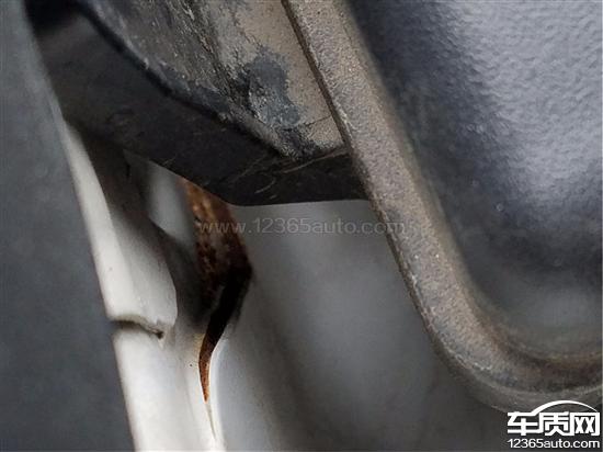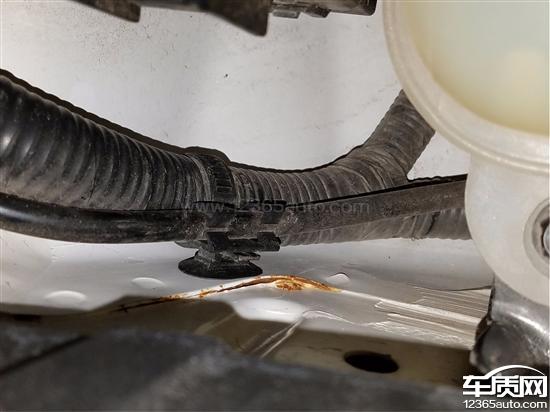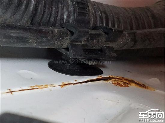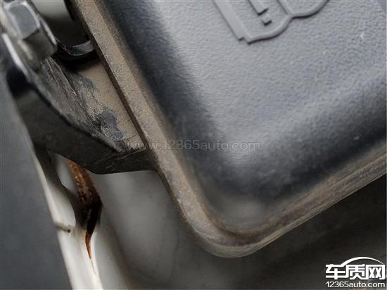 发动机舱内两边对称位置生锈开裂,一边是在冷却液壶旁边的钢板焊接处生锈开裂,一边是在保险盒旁边的钢板焊接处生锈开裂。