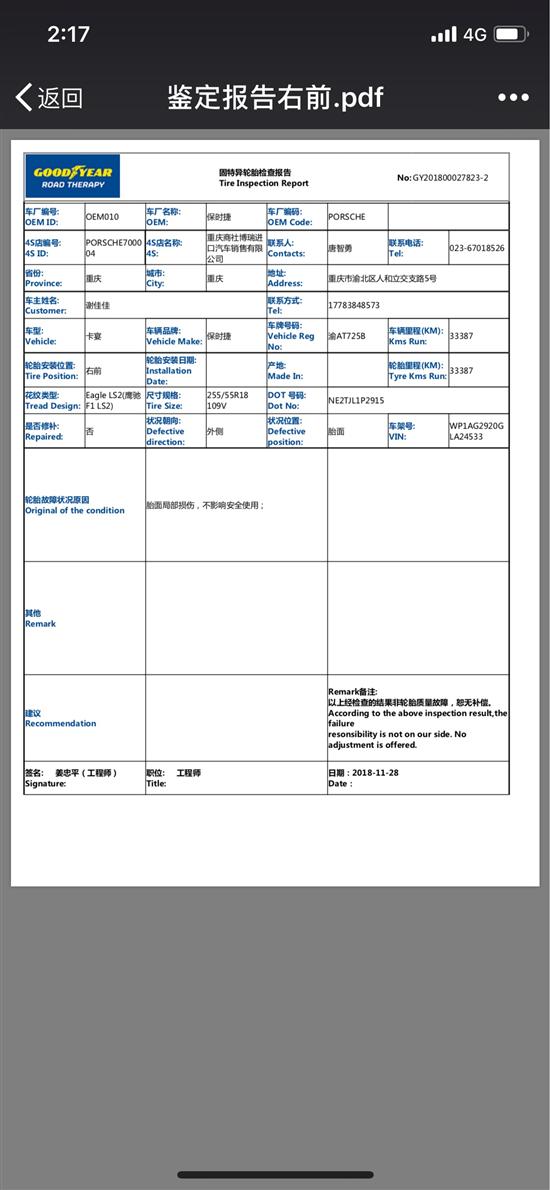 15年买的卡宴,两条前胎是15年29周的。2017年第二次保养的时候,被4s技术人员告知,轮胎轻微起皮,建议更换,当时开起来没有什么问题,就没有管这个事,直到2018年6月开始,由于起皮现象进一步恶化,驾驶室有严重的嗡嗡声,车左右打方向感觉特别飘。每次出去洗车,任何地方洗车的都会告诉我,两个前轮轮胎该换了。我觉得不对劲,几次跟4s人员交涉,4s都是说索赔几率不大。而打固特异官方的投诉电话。官方总是打太极,说轮胎确实有损坏。但不是质量问题,我问后面轮胎为什么没有起皮,她就只一直敷衍,说以鉴定报告为准。他们会反馈上去,等三天就一直这样推脱。他的结果是不影响安全,明明轮胎起皮告诉行驶会引起爆胎。可他们鉴定反应是看到损坏,但是不是质量问题,我就纳闷了,不是质量问题还能看到损坏?明显是敷衍。车开到哪去人家都说轮胎该换了,只有固特异的工程师说没事。难道4s和所有修理店都是说谎的?明显是逃避责任。想拖到保质期以外。就看准了我们投诉无门,找4s又推给工厂,找工厂又推给工程师,工程师又不对外,怪不得4s直接说索赔几率不大。维权的大伙们顶起来,维权成功的一起分享经验!