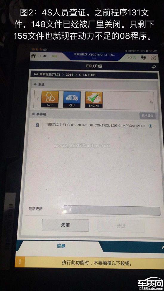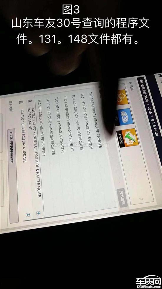 本人之前召回升级后第二天感觉到发动机功率不足。已经投诉过一次。去过4S降级过降成了05程序(原车04程序)。但是第一个降级的,4S技术经理也经验不足,降错了版本。29号晚上出现了0时速,发动机自动熄火。需要挂到P档重新启动(如图)。一路上来来回回启动了将近20次。30号早上我一大早来到4S店把我昨晚出现的故障视频和图片给4S人员查看。4S技术经理查询之前的发动机程序。发现之前的发动机文件131和148文件都不见了。只剩下了155文件也就是现在的08程序。原来厂家为了减少麻烦把之前的文件关闭了。无奈之下我只能升回08动力不足程序。升级完后跟4S人员去测试车子。陡坡起步发动机干轰不走。涡轮不介入。之前的降到05程序。这种陡坡涡轮马上介入,动力爆发出来。还有超车时候车速40多到60多。提速慢。发动机噪声大。档位一直四档。30号下午,有山东车友成功降级。如图3和4。不死心的我又跑到4S,发现还是查不到之前的文件。4S人员说厂家把我们福建区域的版本关闭了。为什么现代厂家做事两套方案。福建地区从未出现过机油增多。却为何来削弱我们的动力。厂家自己做的测试08程序从未公布过。自己的数据谁不会写。我们车主长期开车。对车子我们了解还是你们纸上谈兵了解?既然现代厂家不研发新程序来解决动力不足。那么请现代厂家把131文件和148文件开通。水能载舟亦能覆舟。麻烦车质网反应给相关部门。这件事情已经不是4S店能解决的事情。