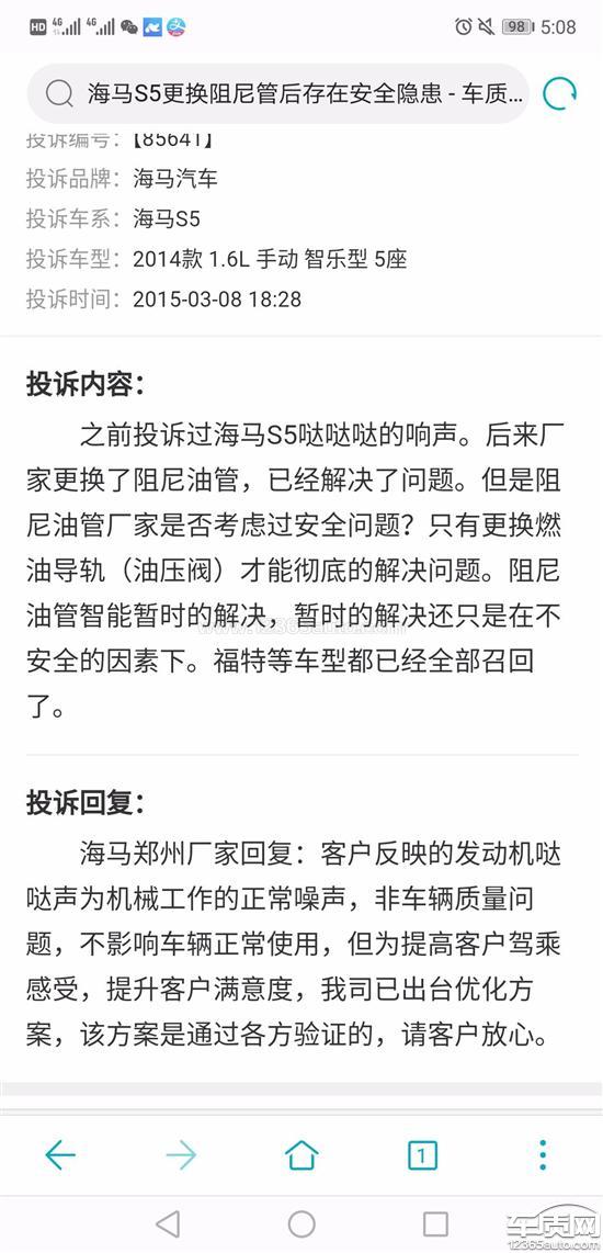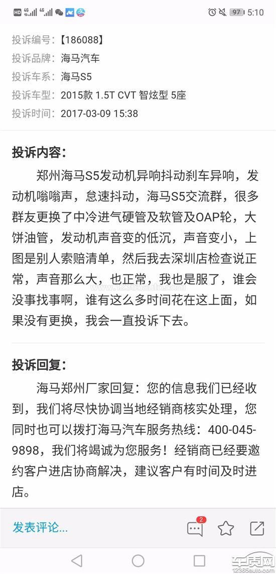 投诉编号:【351945】 投诉时间:2019-03-03 05:28 投诉品牌:海马汽车 投诉车系:海马S5 投诉车型:2015款 1.5T CVT 智炫型 5座