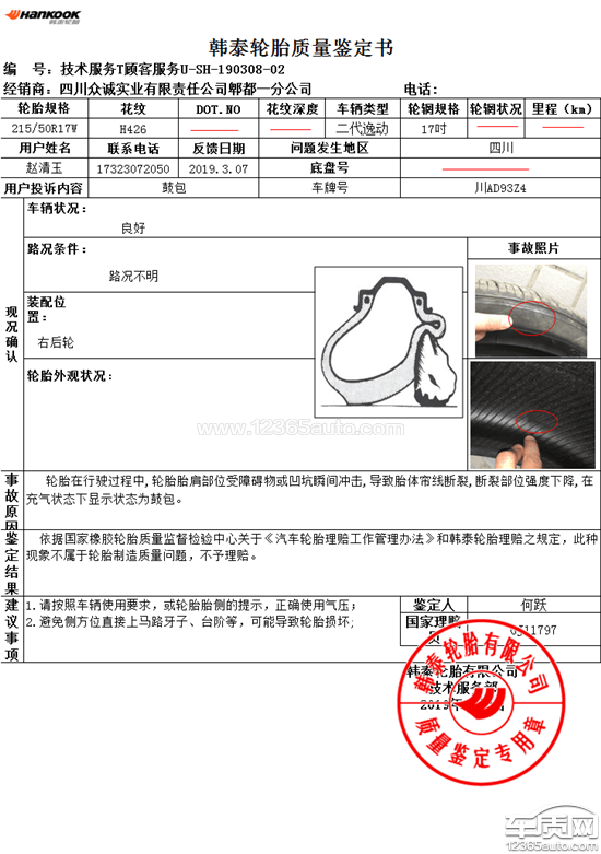车右前轮胎鼓包,非人为损伤,无刮伤。纯属质量问题,向长安汽车公司打电话反应情况,得到的回复是三个月五千公里,已过质保,如需更换需自费。我想说的是一个轮胎跑几千公里鼓包这是不是质量问题,难道国产品牌就是这样做产品的吗?还叫我们老百姓怎么支持国产!最后一张照片是轮胎厂家的回复报告,仅凭几张照片就这么下决定,未免也太过于草率了,不能给推卸责任找理由。