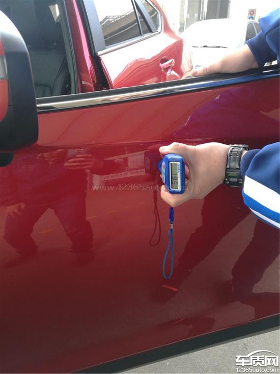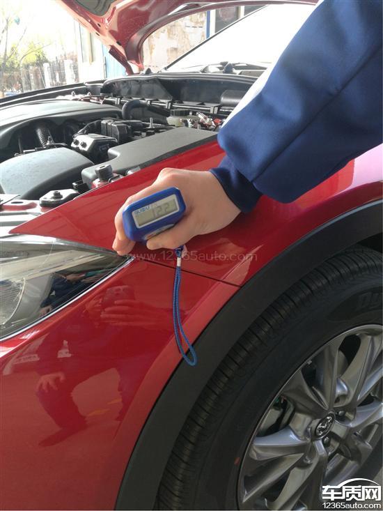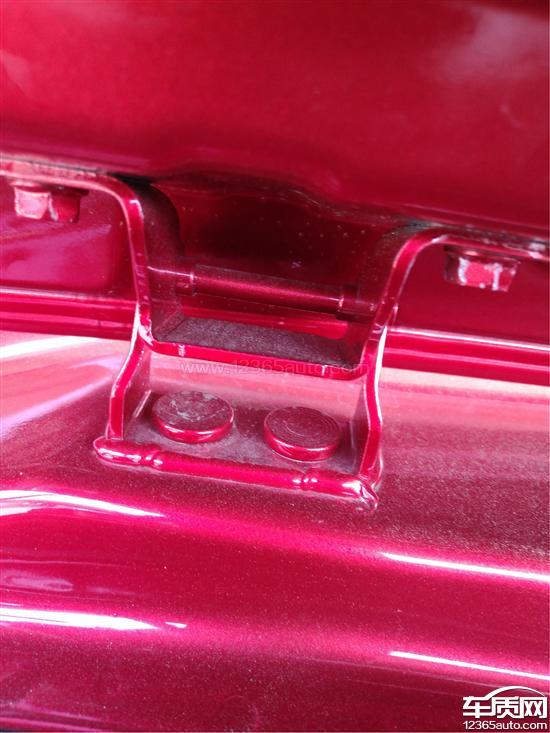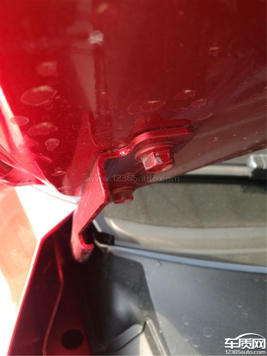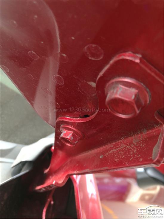 前后机械盖固定螺丝有拧动痕迹,车体前杠黑色塑料部分存在红色残漆,漆面通过专业仪器检测漆面厚度差距较大。