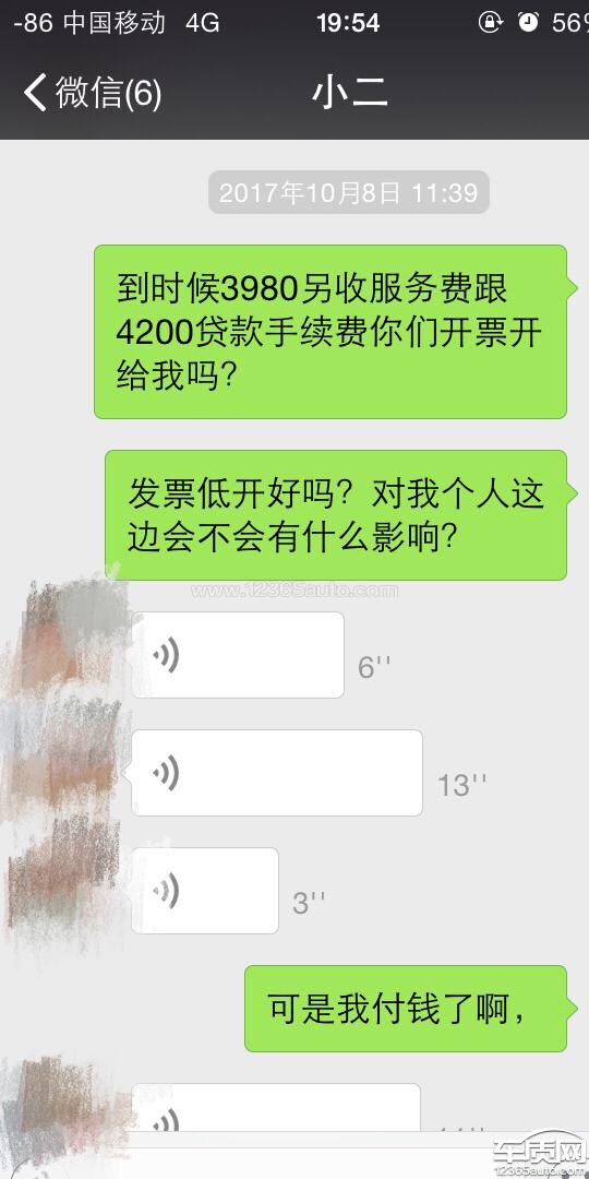 在17年11月慈溪4S店购置高尔夫17款1.6L自舒,裸车含增值税124000,保险6900左右,购置税8000左右,另外对我收取了所谓的免息贷款70000的手续费4200及其所为的服务费3980,当即我进行了质疑,让她说价格明细,销售员曾春回答不上来,就一副理所当然的样子回复道就是行业规则,所有经销商大家都会收取这比费用,所有的消费者也都是付的,费用里面就是必须包含的,而且暗示我没有买真皮座椅,导航仪等附加物,所以更加要收取的意思。并且态度恶劣说就我这个奇葩在纠结这个事情。同时这两笔费用是不能开票的,针对不能开票的事情微信也沟通因为本人很愤慨感觉其中似乎4S店涉及到逃税漏税,这是上升到国家层面的,侵犯国家的利益,因为发票上面只有124000的价格。而4200+3980跟124000是让我分开付款的,感觉服务费跟手续费是不进公帐的,因为怕税务局查账,所以有不同的账户。目前本人要求退还这两笔费用。