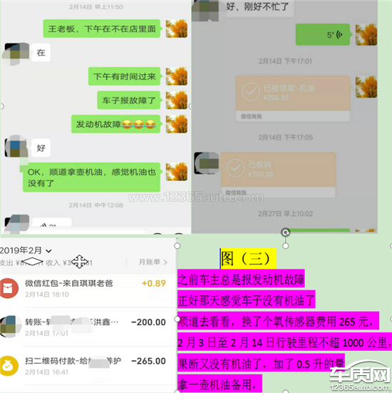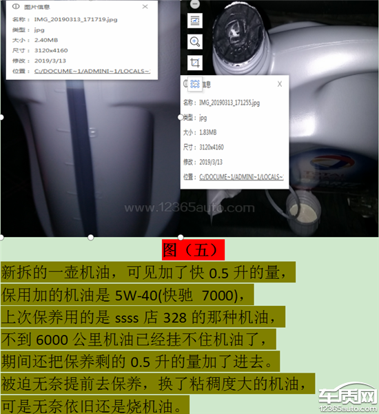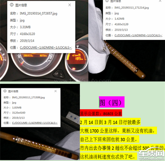 车子刚过保发现发动机烧机油,车子过保了,厂家要求我去4s店免费做了机油测试,直至2018年5月5号左右车子跑了1000公里然后去了4s店,店家看了机油标尺说消耗正常,那时候还挺高兴的,然后就到8月5号在店保养了。中途车子有问题丢在4s店让店员看了下机油,发现机油少了,加了不到一升机油,到12月份初发现机油又没有了把之前保养的机油又加进去了,到月底了发现机油已经挂不住机油了,不得不被迫去保养,那时候才跑6000公里不到。2019年1月1日就去了一家在本市口碑不错的店保养,放出来机油就2升多点。图一照片显示时间为1月12日公里数83447换了,机油标尺显示10个格子油。图二照片显示时间为2月4日,公里数为84667公里,期间行驶1220公里,机油标尺已经挂不到一滴机油,加了0.5升的量显示5个格子机油;图三过年期间车子只要一通电就报发动机故障,之前也出现过频率不高,过一段时间就没了。本以为油品有问题加了95#的油还是不行,就去常去专修店修理,更换氧传感器,也顺便看了机油,惊喜的发现又没有机油了。加了0.5升的量(期间没有拍照片,但是图一跟图二照片可以证明我没瞎说),过年期间最多跑1000公里不得了了,亲戚都是合肥市的自己又没出远门,过年期间还下大雪跟不可能出远门。无奈临走拿壶4升的机油备用着。图四,本人昨天下午又有预感没有机油了,于是熟练的打开车门,弯下腰把前盖的扳手扣下,顺道打开后备箱,拿出未拆开的机油。这次很庆幸没有洒出来一滴,机油对我来说比汽油珍贵的多了。于是乎又加了0.5升的量,机油标尺显示5个格子机油图五就是这次保养加的机油也是从专修店拿的机油,5W-40快驰7000从1月12日83447公里到3月14日86803公里,行驶里程3356公里,再加上1月1日到1月11日最多500公里,本人上下班来回就30公里也未跑长途,算500公里绰绰有余,总里程约4000公里。从保养后机油标尺显示10个格子油到现在已经加了1.5升机油机油标尺显示5个格子油。这期间总共烧了1.5升的机油加5个油标尺格子的油,这算不算严重烧机油。恳请厂家认真对待,妥善解决。标志1.2T正式皮带掉毛都坦然面对了,难道雪铁龙做不到吗。车是好车,人无完人车无完车,不要把自己的口碑砸了。况且这样的问题并不是个例,汽车之家投诉,一页显示30条问题,就有十几条反应车子烧机油。难道这个是个例吗,难道这不算缺陷又或者质量问题。厂家的态度与冷漠,让我成为一个专业东雪黑车户,我反正是每次看到雪铁龙的报道,我就把自己的遭遇品论下来,厂家都恬不知耻还好意思宣传打广告,只要有你在的地方就有我诉苦的地方。从此形影不离,现已经月底了,最近车子跑的有点勤我感觉又要加机油了,等会下班看看要不要添加,到时候我再来投诉。