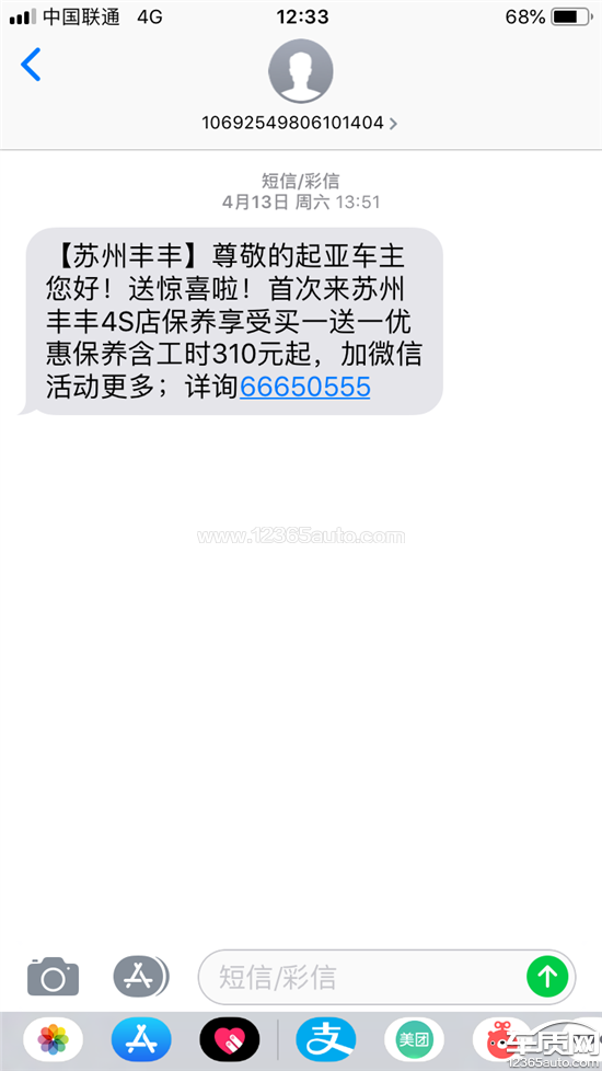 车辆保养快到了,收到了苏州4s店短信说首次到店保养,买一送一活动,310元起,我立马打电话确认并预约,我驾车20多公里跑了过去,到了4s店,车被开进去保养,接待跟我登记,最后让我付620元,我有点疑惑,不是买一送一活动310元吗?他们解释说:这次不算,然后才买一送一,这不是欺诈吗?望厂家和相关部门给予约束和处理结果,具体短信内容请看上传的图片。