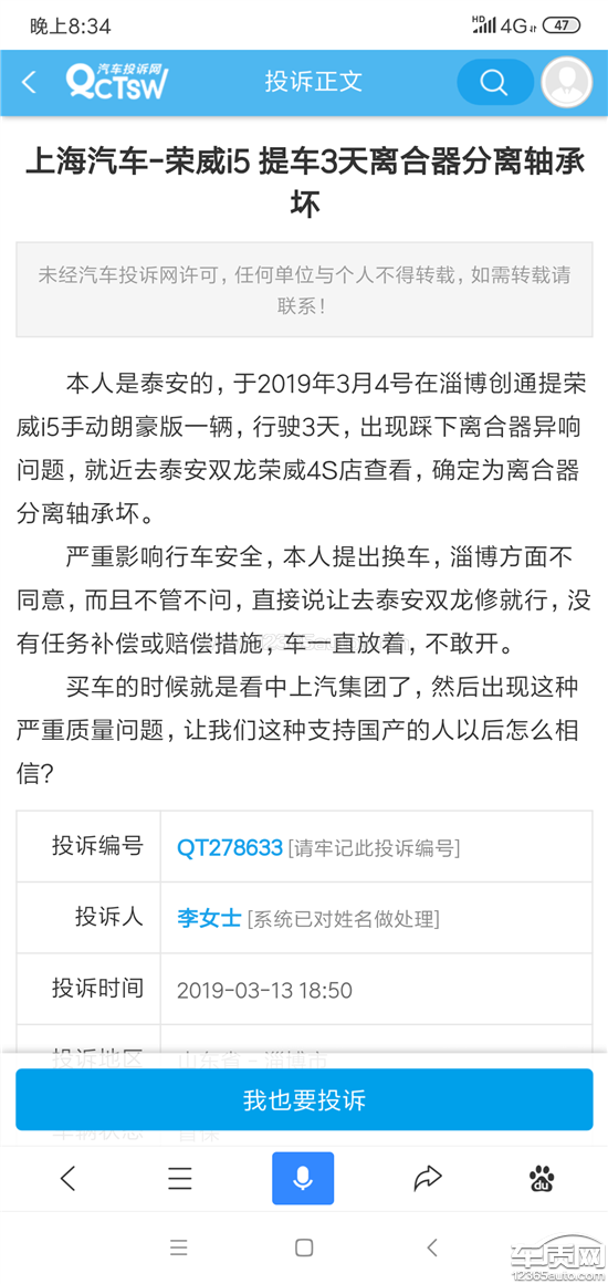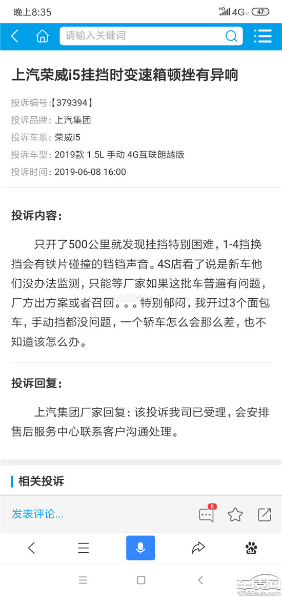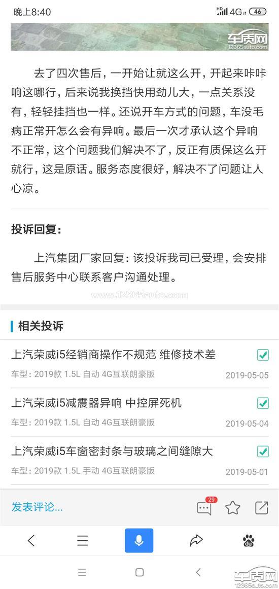 投诉编号:【380683】 投诉时间:2019-06-13 11:42 投诉品牌:上汽集团 投诉车系:荣威i5 投诉车型:2019款 1.5L 手动 4G互联朗豪版
