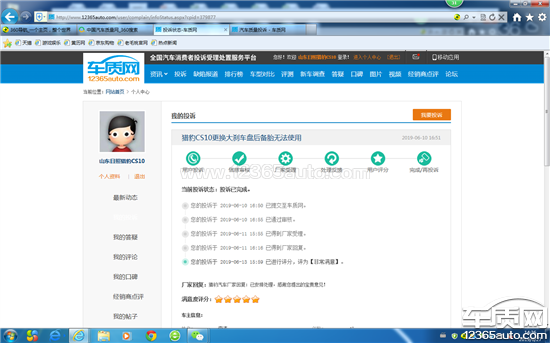 投诉编号:【384382】 投诉时间:2019-06-27 14:45 投诉品牌:猎豹汽车 投诉车系:猎豹CS10 投诉车型:2017款 2.0T 手动 风尚型