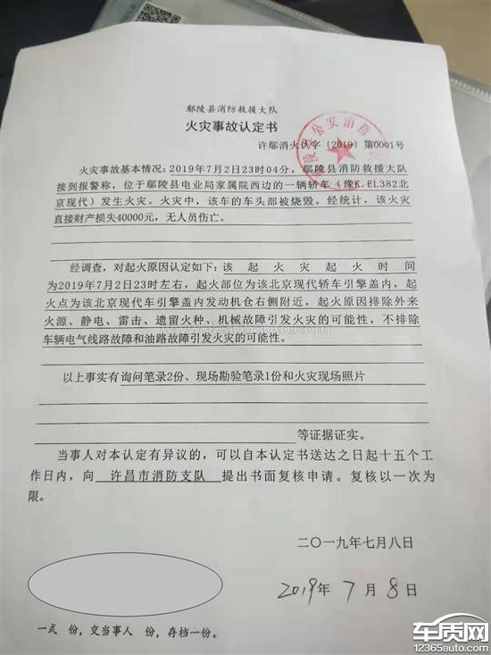 我于2016年9月在北京现代在河南省禹州市的经销商全款购买了一辆白色的北京现代朗动轿车,2016年9月至2019年7月总行驶里程还不到22000公里,尚在质保期内。2019年7月2日23点左右,车子在静止熄火后的大概5分钟左右突然发生自燃,幸亏邻居发现及时发现,慌乱中我立即拨打119火警及110报警,好在消防人员及时赶到现场将火扑灭,才没有造成更大的火灾和人员伤亡,但车的车头部分在火灾中被严重烧毁。派出所民警对火灾现场也进行了勘查检验,警方于7月3日就开具了一份《证明》证明现场并无人为痕迹,排除他人所为。7月3日一早我们立即联系了卖车的经销商,对方派人查看了自燃的轿车表示会尽快联系厂家前来勘察。7月8日消防救援大队出具了《火灾事故认定书》结论为起火部位为轿车引擎盖内,起火点为引擎盖内发动机仓右侧附近,起火原因排除外来火源,静电,雷击,遗留火种,机械故障等引发火灾的可能性,不排除车辆电气线路故障引发火灾的可能性。7月10日经销商带陪同厂家技术人员前来事故第一现场勘察并对烧毁的汽车进行了检查。经过焦急的等待,7月15日我们收到经销商转达的厂家检验结果:车辆右前方雾灯插接器存在外接线路现象(疑似跨接雾灯插接器),外接线路故障引发此次火灾,此事故属于非产品质量问题范畴。用不确定的原因:疑似跨接雾灯插接器,得出确定的结果:外接线路故障引发此次火灾。简直荒唐至极!并且厂家的检验结果与消防救援大队出具了《火灾事故认定书》结论相违背,《火灾事故认定书》结论为起火部位为轿车引擎盖内,起火点为引擎盖内发动机仓右侧附近。应以《火灾事故认定书》为准。厂家的回复我们感到十分震惊!我们的车买来后一直都很爱惜,从来没有对雾灯及其线路做过任何改动!厂家居然诬陷我们改过的车上的雾灯线路,简直是无中生有,信口雌黄!厂家及4S店随意认定汽车没任何质量缺陷或问题,歪曲事实推卸责任,拒绝承担责任的态度令我们很心寒,还放话说如果对他们的检验结果不满意可以去告他们,真让我们觉得十分不舒服甚至愤怒!我投诉双亿汽车销售服务有限公司及相关厂家歪曲事实推卸责任的行为,并要求他们承担以下责任:1、承担我的汽车无故自燃造成的财产损失;2,承担因车辆烧毁后造成工作和生活不便而产生的误工费及精神损失;3,承担因车辆烧毁后因主张权利所产生的交通费;在网上看了好多现代轿车自燃事件的投诉,维权好难啊,现在我们一家人都感到非常无助,诚恳协助让经销商和厂家承担责任,尽快给弱势群体的我们合理的赔偿。深表感谢!