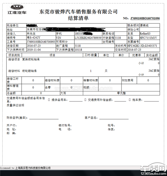 本人于2016年5月16日于东莞俊烨江淮购买瑞风S3一台,在正常使用仅仅两个月后(行驶里程仅5000公里)就发现左前轮轴承出现异响尤其是车速高于80KM时,异响严重。于2016年7月23日在俊烨4S店检查并更换前轮轴承一个,问题得到暂时解决(见图1)。仅仅两年后的2018年7月份(行驶里程50000公里),问题再次出现,而且严重到车速仅40KM时噪音都影响到车内正常交谈的地步。于2018年7月5日再次俊烨4S店检查并更换左右前轮轴承两个,问题得到暂时解决(见图2)。万万没有想到一年后(行驶里程73000公里),问题再次出现。作为一台正常上下班(每天来回80公里且一半以上是高速、路况良好)使用的的家用车,仅仅三年的车,同一个问题连续出现且得不到根本解决,让车主如何信任江淮?目前4S店因为车过三年,不给处理,要求自费。而且工时费400元、配件320元?又是谁定的价?合理吗?而且态度差,师傅说这个换了也大概就用个2万公里(这是厂家明知道自己的质量不过关而无视的问题)还一味推荐说送一次4轮定位(见图3)。厂家400客服更离谱,只会一味说这不属于主要部件,已过保,还强硬挂断车主的电话(见图4)。国家三包同样问题重复出现,就要求维修。现要求江淮立即维修并彻底解决该问题;同时建议国家工商总局要求江淮给予召回,因为很多车主可能并没有注意到这个问题,而被蒙骗!