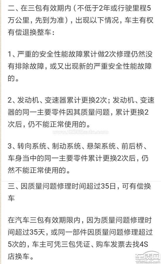上一次进站,换了两根减震器和做了四轮定位无数次后车子行驶状态表现为正常,时隔不久,使用不到一千公里后,车子再次向左跑偏,另车辆轮胎到轮眉两边距离左低右高相差一厘米状态一直存在,本车主致电厂家,厂家屡次推脱让进服务站检查排除故障,车主已进站多次,另早已达到三包法规定退换车条件,可厂家如同旁观者对待客户很消极与傲慢。这点作为客户实在受不了,以上图文中三包法规定范围内,安全性能出现两次就可以退车,本人早已达到相关标准,无需多言,现本车主就是要求退车!强烈要求退车。