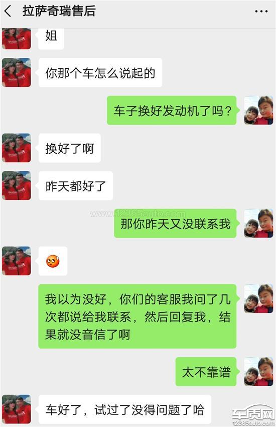 奇瑞汽车厂家回复:接到贵网反馈的客户信息后,我司非常重视:据我司拉萨丰田4S店反馈:车辆问题已经处理好了,会积极联系客户协调处理后续问题,为客户提供周到的售后服务和保障。同时也非常感谢客户对奇瑞汽车的关注和支持,衷心祝您生活愉快,工作顺利!