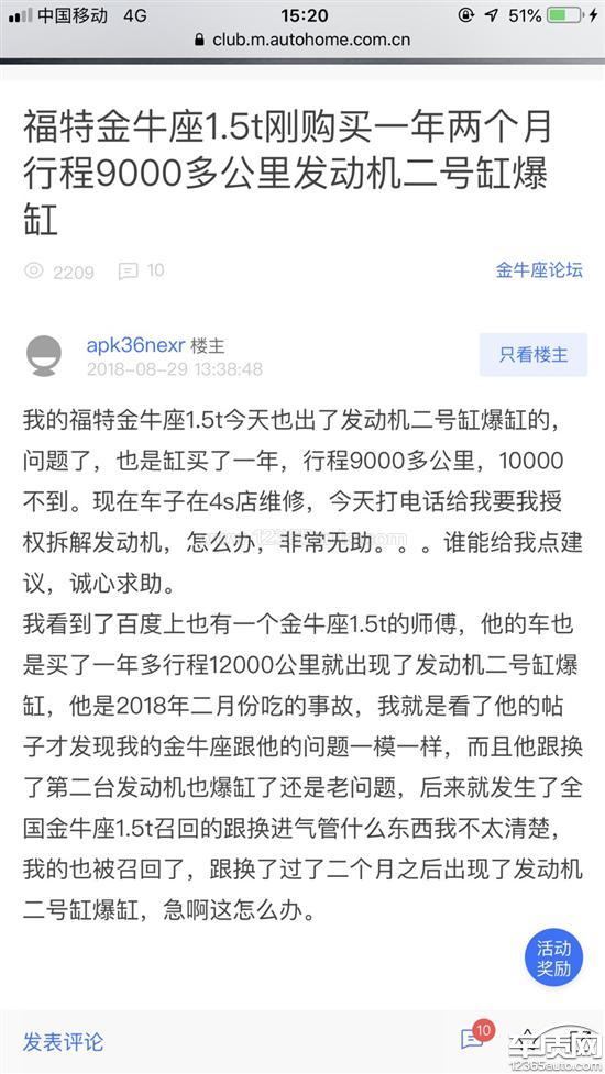 发动机爆缸福特金牛座1.5T行驶到四万多公里一年半的车。还在保修期内现在厂家一直不处理。推卸责任。网上也有案例也是二缸爆缸。而现在我的车也是二缸爆缸。