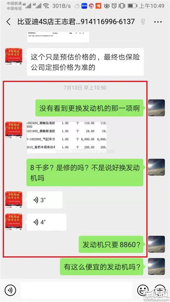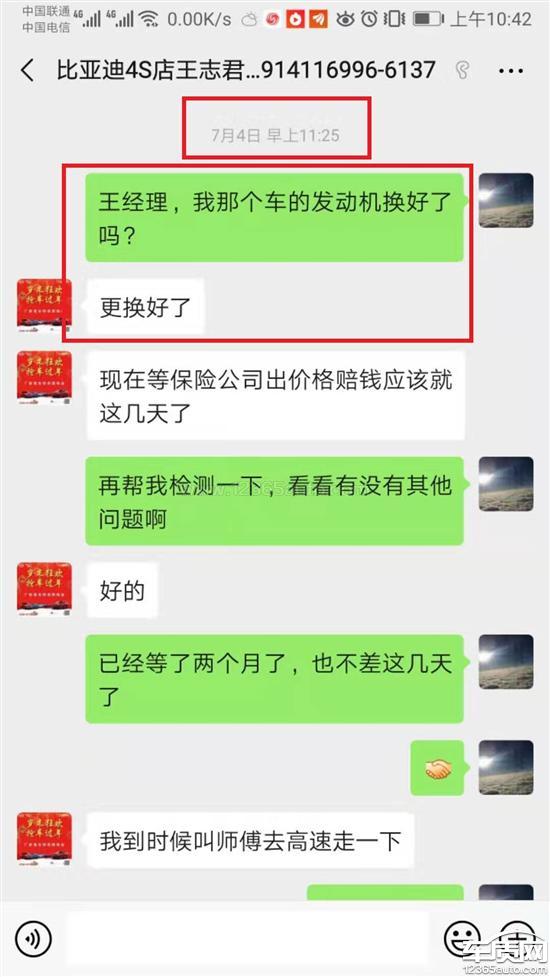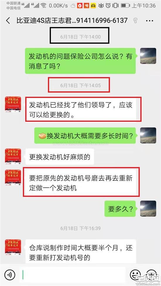 本人在今年5月13日行驶在广州高速路与肇事车发生严重事故,将受损车拖至位于龙华的4S店修理,在临近约定取车的时候被告知路试时发现方向盘有问题,方向盘换好之后,一个月后又告诉我发动机漏油。6月14日跟我说发现发动机漏油后4S店问我能不能接受厂外焊接修补发动机缸体,我明确表示不同意,要求更换新的发动机(事后我咨询过其它比亚迪4S店也是说可以换新的发动机,不是无理要求),4S店明确答应可以换新的发动机,并回答了我怎么换新的发动机和换新的发动机大体流程,4天后的6月18日我再次询问他们与保险公司沟通结果,他也告诉我保险公司已经同意可以更换新的发动机,并在半个月后的6月28日询问换发动机的进展,跟我说发动机已经发货,一直都没有跟我说不能换发动机。7月4日再次询问进展的时候告诉我已经换好了发动机,没有告诉我只是更换了发动机缸体。直到二个月后的7月13日通知取车时,也没有告诉我没有换发动机,我看保险清单时才发现并未更换新的发动机,只是更换了发动机缸体。在我看保单之前,没人告诉我没有换发动机,如果我不看密密麻麻几页的报修清单,就以为发动机已经更换,存在明显欺骗消费者的行为。为了维护消费者的正当权益,本人多次去4S店沟通协商,要求4S店诚信为本,实现对消费者的承诺,都没有正面积极回应,把责任推脱给保险公司。那我不明白既然保险公司肯定不能更换发动机而4S店为什么欺骗我可以换发动机呢?我想找总经理给我一个合理的解释,负责售后的业务员、主管都不敢带我去他办公室,也不告诉我电话等联系方式,我去店里找销售人员让他告诉我李总的办公室,竟然也没有一个人敢带我去总经理办公室,我感到万分蹊跷,为什么没有一个人给消费者带路?这是一个正常的4S店吗?万般无奈之下我使用过激的行为才有人带我去了总经理的办公室,但是不巧人不在办公室,看到桌上的名片,打电话要求面谈也被无理拒绝。作为店里的最高领导对消费者如此态度,是傲慢?是心虚?在拨打了比亚迪售后服务电话后,他勉强跟我见面,但是没有同意我的要求:按承诺更换发动机或者恢复车进店时原状我去其它的4S店修理。于是我找到了交运委,交运委跟我12月22号去店里,他也拒不接受协调,要我去法院起诉,我们都知道汽车如果停在车库一年后就几乎报废了,而法院判定一年半载过后车早已不能开了,除非我报着车辆报废的决心才可能起诉。事故车到店至今已8个多月,春节将至,十分影响我的出行,请帮我协调处理,十分感谢。敬盼佳音,谢谢。