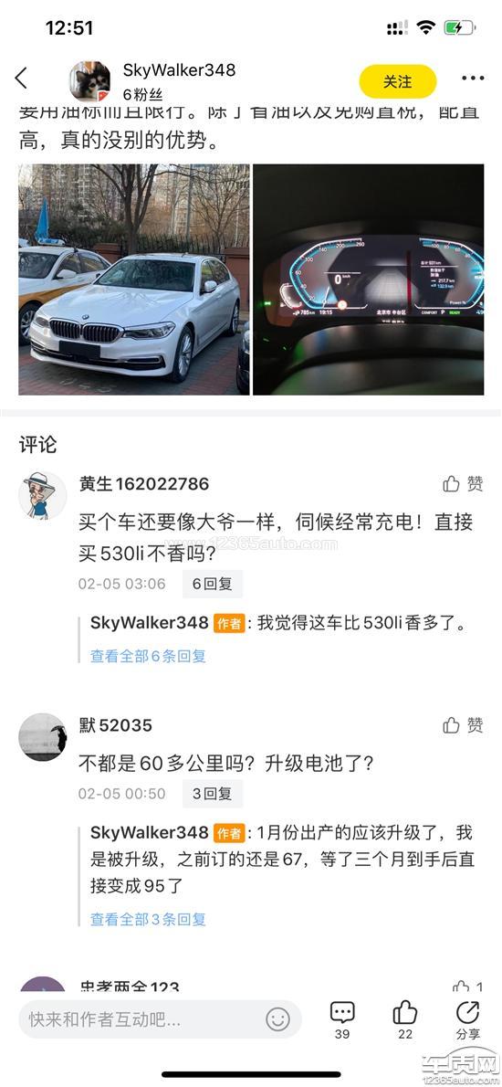 无意逛论坛,发现有1月15日提2020款宝马530le的车主电池续航里程为95km,我的车是2019年12月底去4s店洽谈,1月6日提车的,续航里程仅为67km,同款车型相隔不到10天,电池续航里程相差近30km。网上查不到任何95km续航的相关信息,在我了解这款车的时候,4s店也没人跟我提及,然后暗改电池续航里程。我认为这是严重的欺瞒消费者行为。希望借助贵平台能为我们消费者维护正当权益。