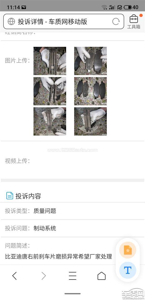 比亚迪唐右前刹车片磨损异常希望厂家处理2020-03-03车型:2018款 2.0T 自动智联 尊贵型 7座 国V