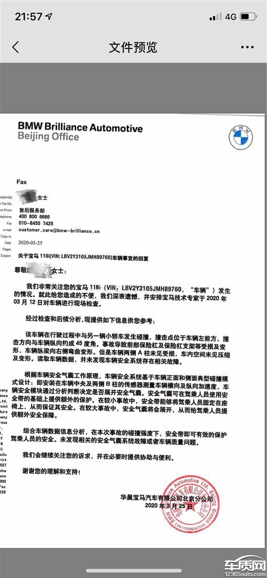 投诉编号:【460348】 投诉时间:2020-04-04 22:16 投诉品牌:华晨宝马 投诉车系:宝马1系 投诉车型:2018款 118i 运动型