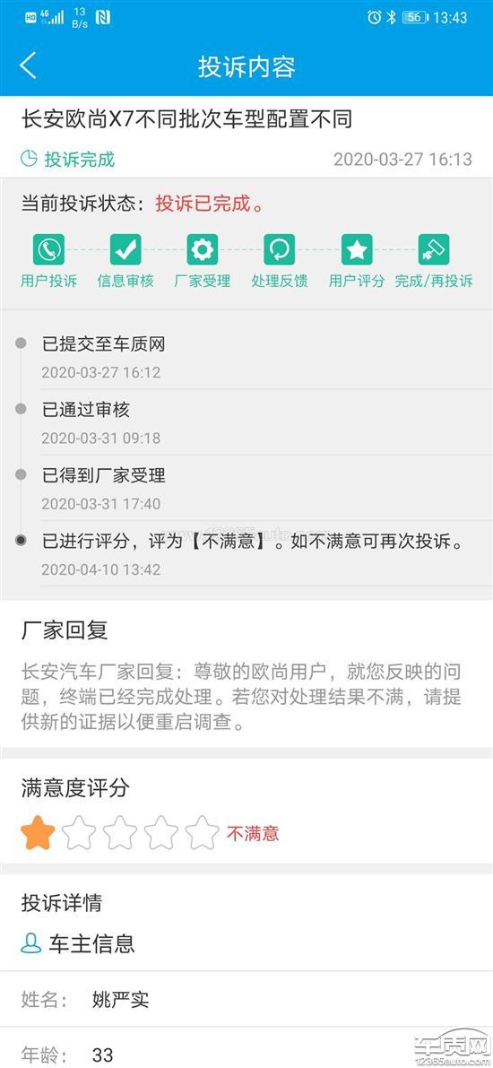 长安欧尚X7不同批次车型配置不同,上一投诉厂家未回复!