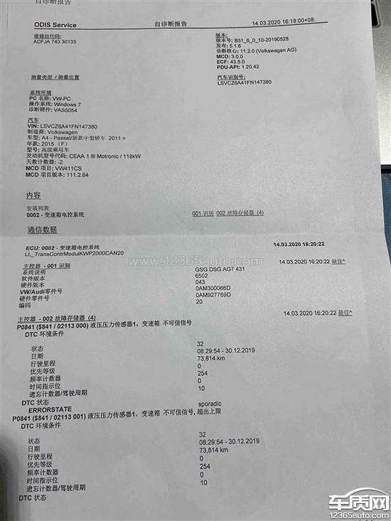 上汽大众帕萨特变速箱故障灯亮有质量问题2020-04-13车型:2013款 帕萨特 1.8TSI DSG 尊荣版