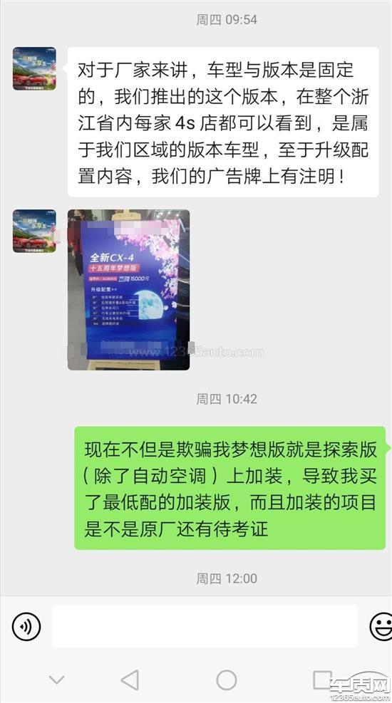 本人于2020年4月9日马自达4S店购买一辆马自达cx4梦想版,于4月29日厂家客服回访时才发现4S恶意欺骗,因为我想注册mymazda这个APP,提完车后当天晚上我就向销售咨询为什么注册不了,销售让我等三四天再看,说是厂家那边我的客户资料还没更新,后来几天后还是注册不了,我也打了厂家客服咨询,当时客服没有跟我核实车的版本,就说可能是4S店没有将我的资料上传,然后我又问4S销售,他又让我等。26日去4S贴膜,我还在向他咨询这件事,他还说回头再帮我核实下是不是店里系统的问题。直到29日厂家客服回访时,我顺便又问了为什么就是一直注册不了mymazda这个APP,厂家客服告诉我低配是无法注册的,然后用排除法帮我推断出我购买的梦想版就是低配的加装版,厂家客服说没有这个梦想版的,之前销售一直说是没有自动空调的探索版(中配)升级的,还一再说是厂家专门为十五周年庆推出的梦想版,店里的宣传广告上也都注明了升级的均为原厂配件,所以我当时是相信的。因为在其它4S店看车都是直接说明版本的。(这些我有录音证据,因为第一次买车,很不放心,所以有机会录音的地方都录了音)。另外发现销售人员用的是假名,给我和别人发的名片都是用的假名(是我提车好几天后偶然点了销售的朋友圈才发现,后来去贴膜的时候在他们人事组织图上找到了他也看到了和他朋友圈一致的照片及真名,当时是在不安到底是有什么特殊的原因)。甚至和我签的合同也是用的假名,合同上有他们领导签字(领导是不是用的假名不知道),但是合同没有盖公章,而且提完车没有给我合同原件客户联或复印件。提车也没有告之新车检测PDI,我根本不知道还有这东西,所以也不知道这车是不是原本就有问题。