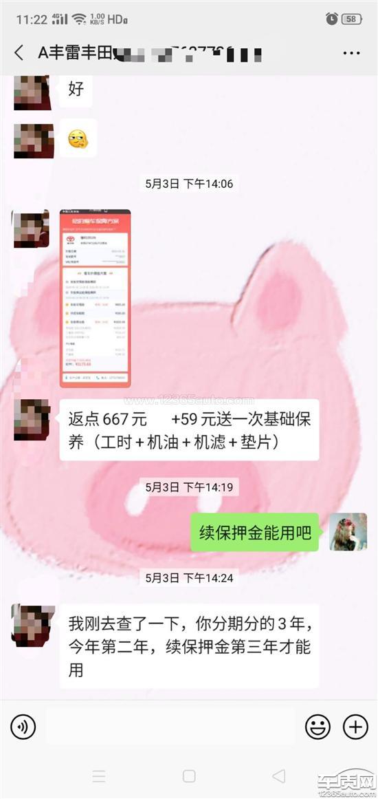 去年购车收取2000块钱续保押金,告知今年续保抵用。但是今年跟我说要连续购买3年才可退还,还必须要在他们店里购买保险才可以!打电话咨询连着4.5天没有回复,后打厂家电话投诉。本来都已经达成一致:我今年继续在他们店里续保,押金和返点都退还。但是昨天(5月8号)他们店的老总 姓苏,带着一名店里工作人员到我上班的地方来找我。点名要让我为他服务,还问我为什么要为难他们,说想看看我到底是什么样的!我非常气愤,然后发朋友圈倾诉,然后他们客服经理打电话质问我为什么要发这样的朋友圈,说我这样做太过分!并且告诉我,接下来的保险必须在他们店里续,否则押金不会退给我。我现在就要求把我的2000押金退还给我,或者我今年保险在他们店里续,但是承诺过我的返点和押金必须如数返给我。