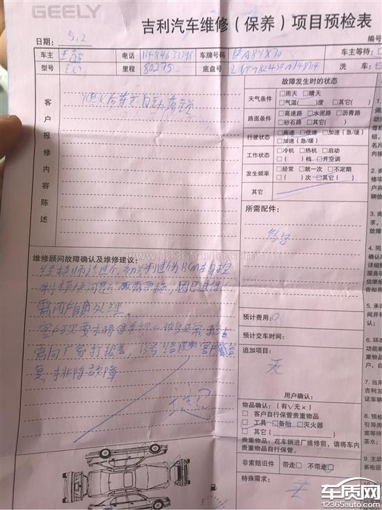 吉利汽车厂家回复:您的信息我们已经收到,将尽快协调相关4S店与您核实处理,厂家也将持续关注后续处理情况。感谢您的支持与谅解,如有疑问欢迎您致电吉利汽车客户服务热线:400-886-9888。