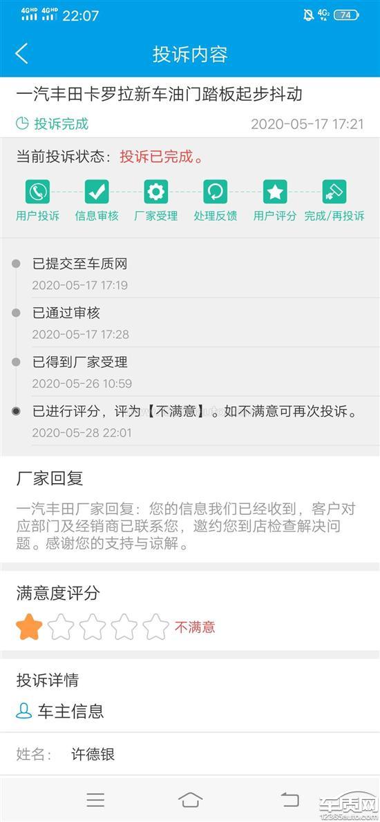 一汽丰田卡罗拉新车油门踏板起步抖动,厂家回复说客户服务部门与经销商已联系我,但我完全没有接到相关电话,是不是在一拖再拖,请厂家赶紧对反映的新车油门踏板共振问题给出解决的办法。新车行驶一直存在油门踏板共振,尤其起步与急加速阶段更明显致脚麻难受,极影响驾驶,多次临4S店反映皆无法处理,在车友圈也了解到多人反映此问题,希望厂家能针对此问题给出解决的办法。