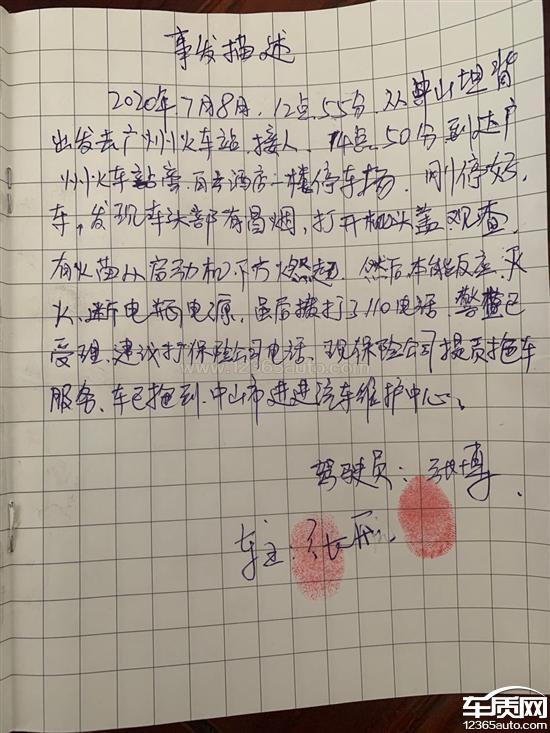 2020年7月8中午从中山出发到广州火车站接人,行驶到广州火车站附近停车场发展机舱里有烟雾冒出,并有刺鼻气味,迅速打开车引擎盖,发现启动机下方部位(波箱位置,机电控制单元)有烟雾和明火冒出,急情下扑灭。随后报警以及保险公司,车已经无法启动。