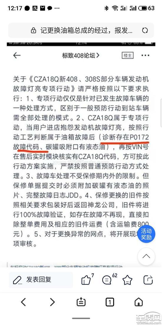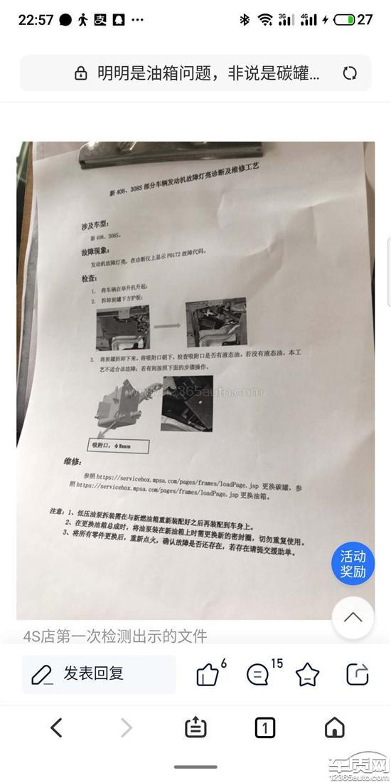 本人于2015年购进一台2014款东风标致4081.8自动豪华型,在2018年11月份左右,车辆突然打不着火,无法启动,由于所住县城没有标致4s店,最近的4s店里所住县城也要100公里,并且车辆刚刚出保,所以无奈之下在我们当地的汽车维修店进行检查,检查结果是车辆碳罐进满汽油导致车辆打不着火,无法启动的。经询问维修师傅是什么原因造成碳罐里进满汽油的,维修师傅说是油箱的止逆阀问题造成的,一旦有这种问题,油箱不能加满油,加满油就容易碳罐进油,并且这个零部件不能单独更换,必须连油箱一起整体更换。随即我就打厂家客服,当时客服回答是车辆已经出保,无法进行免费索赔,必须自费更换。由于不更换进满汽油的碳罐车辆就无法行驶,我就在我们当地维修店更换了新的碳罐,旧碳罐随手丢弃。今年5月份车辆又出现相同故障,同样还是油箱缺陷问题导致的碳罐进油,车辆无法启动。今年前些时间在汽车论坛里查看到有同样问题的车主进行了油箱和碳罐的索赔,并且本人也在4s店得到了印证。2019年标致厂家给所有4s店下发了内部文件,如果有出现我这种问题的车辆,在车主的要求下是可以进行索赔的,但并不是公开召回。于是我于今年6月份向4s店进行索赔,但是4s店要求必须要是原车碳罐才给予免费更换。我的车辆故障都符合索赔条件,唯独没有原车原厂碳罐,我对这种索赔条件不能接受,明明是油箱缺陷造成的碳罐进油,跟是不是原车碳罐有什么关系呢?进一步对4s店表达诉求,但是4s店也表示无奈,说是标致厂家这样要求的,于是我拨打厂家售后服务热线,最开始厂家客服就不承认有对4s店下达内部文件,后来在多次打电话后才承认此事。我将问题反馈给厂家客服之后,客服做登记,说会帮我将诉求上报,但是总是等不到答复电话,后多次打电话,厂家客服就说还是要原车碳罐才能进行索赔,每次打厂家客服电话,厂家没有一次主动回复的。至今我的诉求还没有给处理,对于厂家的答复我无法接受,根本不合理。2018年我更换碳罐时,厂家也没有下达召回通知,也不知道厂家对4s店下达的有内部文件,也自然不知道厂家还规定索赔要原车碳罐才行,所以更换碳罐后谁也不会把不能用的原车碳罐留着。并且本身是车辆油箱的缺陷问题导致的碳罐进油,如果不更换油箱,就是再换100个原厂碳罐还是会出现同样的故障。厂家这种行为同样在轮胎召回时出现过,属于推卸责任,故意隐瞒缺陷,并设置障碍,限制消费者合理维权。后附厂家内部文件及行车电脑故障显示