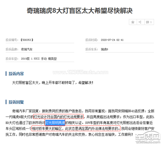 奇瑞汽车厂家回复:“接到贵网反馈的客户信息后,我司非常重视:据我司广西鑫广达4S店反馈:全新一代瑞虎8前大灯的灯光设计符合国内的灯光法规要求,并且亮度超出法规要求;作为出口车型,此款LED大灯也通过了欧洲市场对灯光照明亮度的相关认证。SUV车型的车身高度对灯光照射出去后会在靠近车头区域形成一个相对轿车要大的暗区,此状态是满足国内外法律法规要求的。我司会继续做好客户安抚工作,同时也非常感谢客户对奇瑞汽车的关注和支持,衷心祝您生活愉快,工作顺利!“