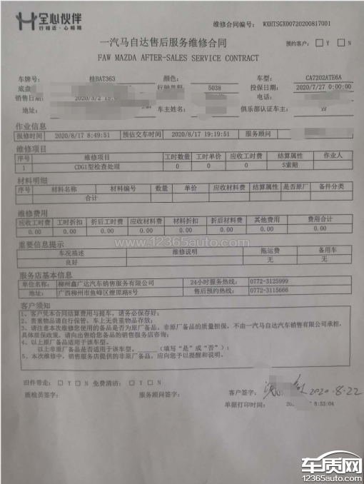 投诉编号:【513091】 投诉时间:2020-08-23 22:39 投诉品牌:长安马自达 投诉车系:马自达CX-4 投诉车型:2020款 2.0L 自动 两驱 蓝天活力版