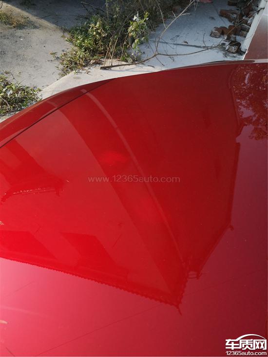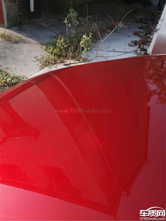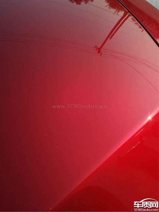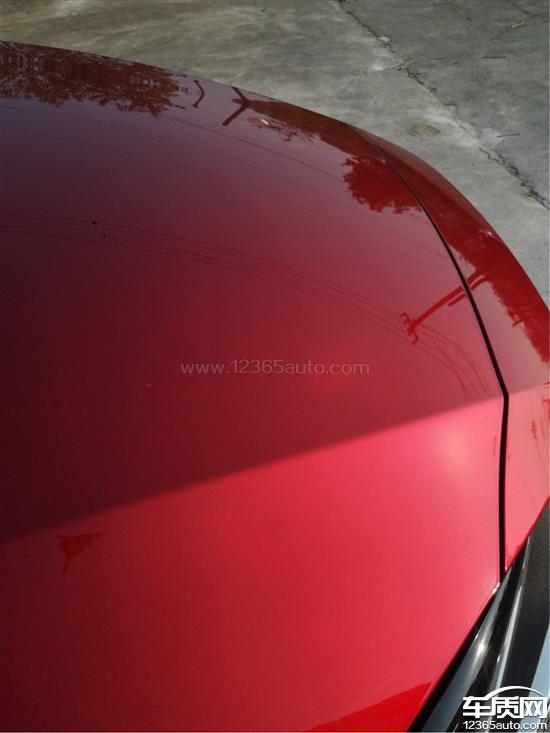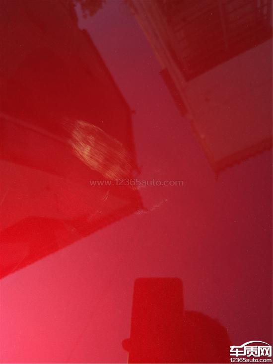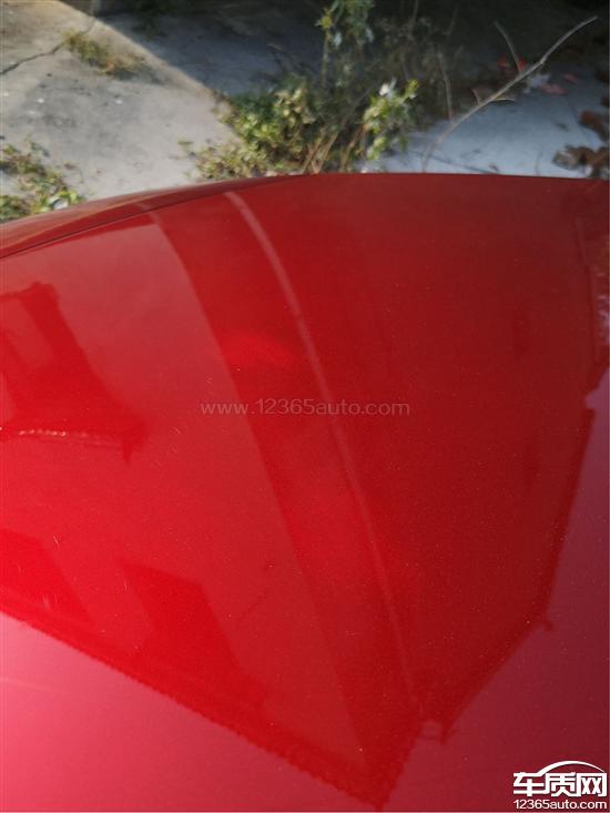 新车引擎盖大面积多处油漆色差,阴影部位内部明显类似打磨或刮痕。