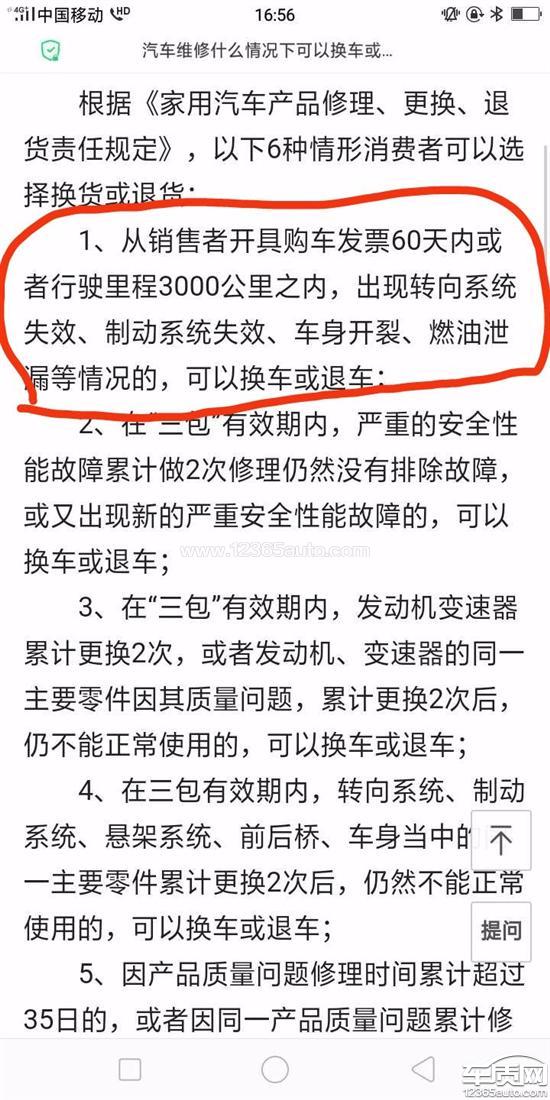 2020年7月23日提车,8月11日更换真空泵总成,要求换车,再三说没达到三包法!15天都没有给答复,急用车,本人已妥协!答应更换,赔偿了600块钱过路费,一个行车记录仪,7月26日提车回去,到7月30日,真空刹车又出故障,在在行驶的过程中,踩刹车,车打飘,我连忙靠边停车,发动机显示请检查发动机,经过电脑检测又是真空助力太低不合理故障,检查一天未果,下午5点半左右4s店把故障码p050f00,转告厂家,厂家回复说更换真空管,我此次再三强调退换车,还是说没达到三包法。咨询了一下律师个其他4s店的销售经理和售后经理部,他们都说达到了三包法,更具三包法的第一条未满3000公里或60日之内都有权利要求退换车标准。
