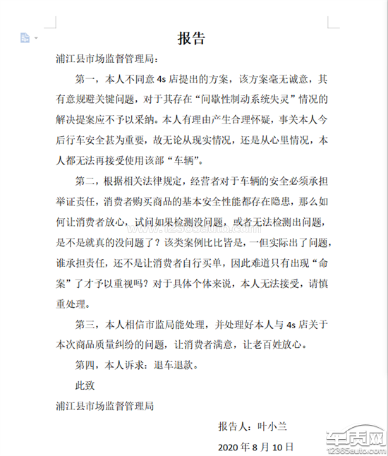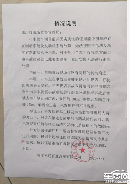 本人于2020年5月28日购置东风日产逍客车一辆,总价为16.88万元。提车时发动机有异响提出质疑,要求换一辆。4S店坚称不会有问题,并以手续已经办完为由,不同意换车。7月14日上午,途经一段下坡路,长300米左右宽6米,有两个转弯。车开到第二个转弯处,转过弯后,车辆突然自行加速,刹车失灵,多次踩刹车都没用,速度减不下来,撞上路边的护栏,IEB自动功能失效,为了人身安全强制息火,向前滑行了200米左右才停下来。事发后,车拉入4S店,第二天本人去查行车记录仪记录,发现出事故时段记录没有了。本人申诉此车有间歇性制动系统失灵和发动机怠速不均匀问题,为保证生命安全,要求退车。根据《消法》三十条,在三包有效期内由4S店承担举证责任,4S店的三个举证(见图片)能证明此车没有质量问题吗?!现4S店一直未就此事进行处理!