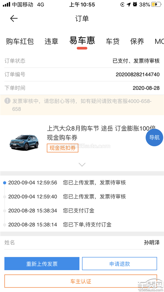 本人在2020年8月底,在“易车网APP”看到商家有2个购车活动可以参加,第一个是1元抵500元红包活动,第二个是8.18元抵818元购车款的活动。本人在网站下完两个活动订单后,到指定4S店购车,购车完成,4S店提供的是外地的购车发票,不是本店的,致使活动无效。因为外地发票和订单指定4S店名称不匹配,活动无法参加。4S店找不到出面解决的负责人,大众的官方投诉电话打了很多次,至今无人联系我解决。