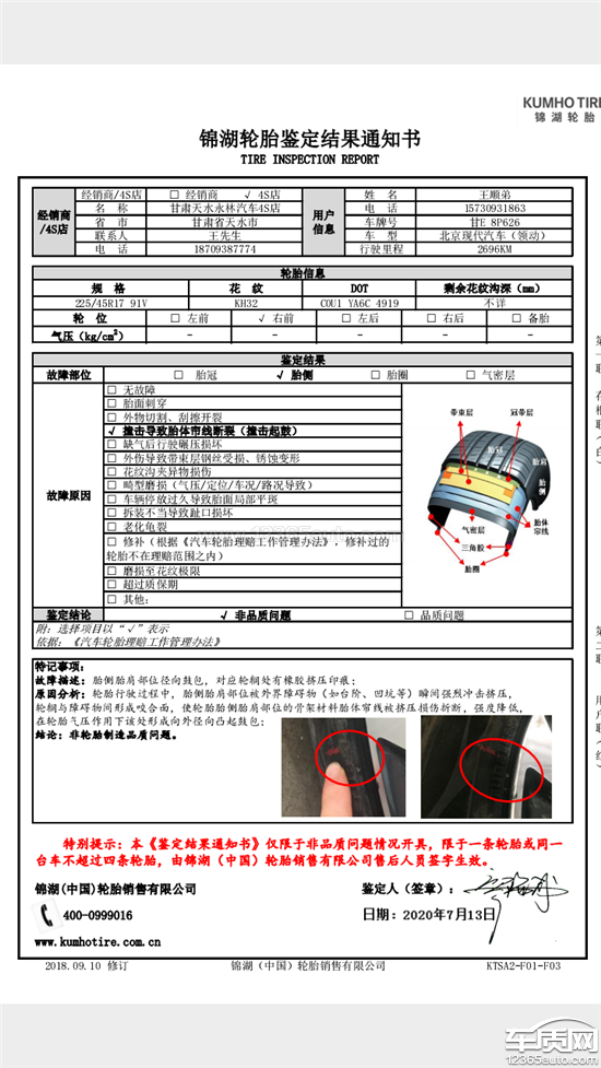 锦湖轮胎厂家回复:尊敬的用户:您好。建议您前往就近北京现代授权特约店检查车辆,特约店在三包及保修政策范围内免费检修车辆,您如有疑问请致电北京现代官方服务热线400-800-1100。感谢您对北京现代的关注。锦湖轮胎厂家回复,我司售后已对轮胎进行检测,并出具鉴定结果通知书,如您有疑问请致电锦湖轮胎全国统一客户热线400-099-9016。
