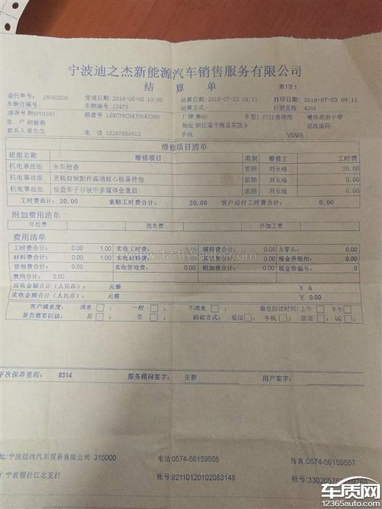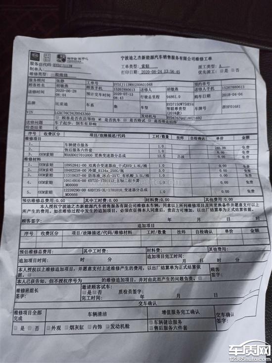 比亚迪秦新能源质保期内4S店收检查费2020-09-09车型:2014款 1.5T 自动 DCT 旗舰型