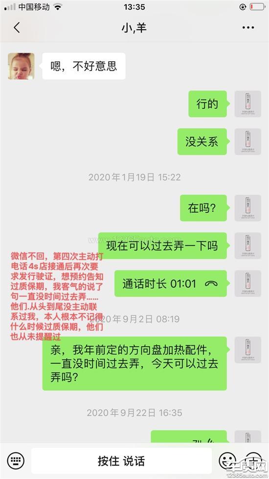 从本人驾车前往4s店起,车辆在保质期需更换配件,工作人员检查后说需要厂家发配件到店,留下联系方式后,期间,我主动联系4s店共4次,分别遭受了两次预约失败,一次联系未果,最后一次直被接告知过了质保期,预约失败的原因分别是,4s店找不到配件以及4s店当天及近日不接受预约,期间近半年,从一开始4s店从未主动联系我方,也未告知期限截止日期,甚至找不到我的联系方式。每次都是我去联系他们,我在质保期申请下来的配件,现在说我过3年保质期不能用了,那就算过了质保期之前申请下来的配件总是属于我的吧,我拿走属于我的配件总行吧,现在厂家就是一句话你现在过了保质期3年了都不算数了,我想问一下那万一人家车辆3年质保期最后几天坏了,等你配件从厂家调过来就直接过保质期了,就不给别人换了吗?第一次主动询问配件到货,工作人员居然说没我号码,我也是醉了,当时就预约去更换,下午4点,告知5点半下班,我认为是可以来得及的过去旅途15分钟左右更换配件半小时,结果4s店人员说休息找不到配件,我心想就奇怪了都什么年代了,离了谁还不能运作了,这不都是走流程的东西嘛,我就说算了,一直都是很客气的态度。第二次主动预约从当日往后4天都有空帮我安排,语音通话,被告知从1月19号到1月24日全部预约满不接受预约,表示很无语,结果4s店工作人员和厂家说当天她让我过去了,是我没过去?谎话黏来就是。第三次联系工作人员没有回复,第四次在没有回复的情况下主动电话联系4s店然后,又让我发行驶证,告知过了保质期不给换了,我客气的说了句我之前没时间过来换,后来说是我没时间来~~我预约屡次约不上,不是我没时间,是你们没时间帮我弄好吗?半个小时而已,还被告知我的配件已经被别的客人用掉了…什么鬼…在此期间没有主动和我打过一个电话也没有通知过质保期时间,本人也不知道什么时候过保质期,一直也没去注意这个事情,怀疑是4s店故意拒绝预约拖延时间过3年保质期,保质期厂家给予理由是过保质期质保服务不再受理,3年保质期内申请下来的配件,我方要求申请下来的配件归我,我自己找人更换,也受到拒绝。