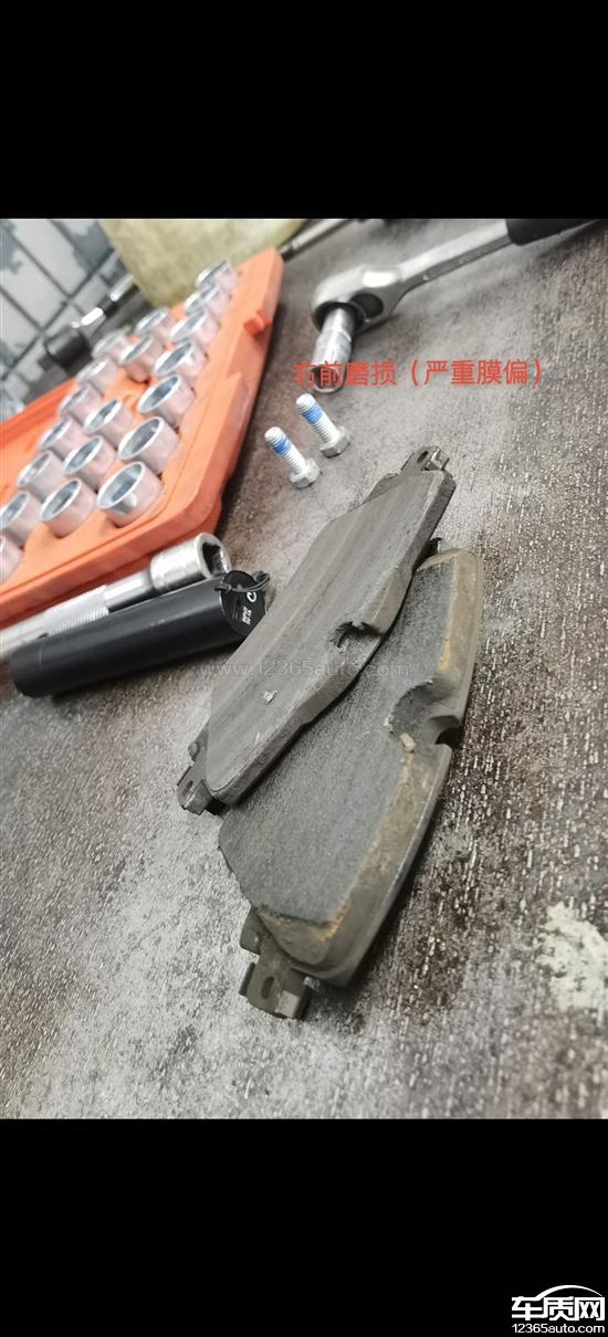 右前刹车片严重磨偏,无报警提示,无故障提示。在左前刹车片只用一半不到的时候,右前刹车片已经全部磨掉,磨偏后刹车发出巨大声音,并损坏刹车盘,导致左前和右前刹车片和刹车盘全部更换。