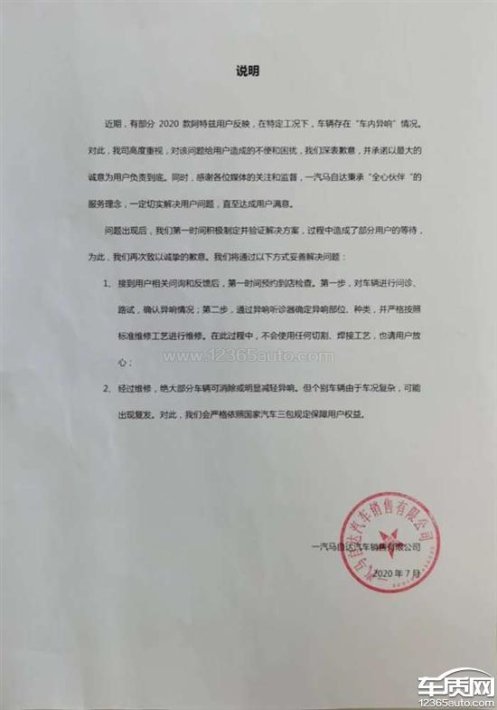 一汽马自达厂家回复:经销商已与用户取得联系,预约时间到店检查处理。