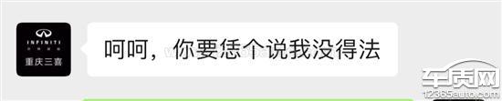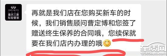 1.买车时候销售作为卖车的附赠服务,赠送了英菲尼迪的终身保养,但当时并未告知必须在此店一直续保,直到今天4s店直接发微信威胁,不在店内续保就享受不了服务。为什么提前不告知说明。2销售不专业,答非所问,给的答案极不具有专业性,并且呵呵我,这是什么态度?如不处理,会持续投诉。
