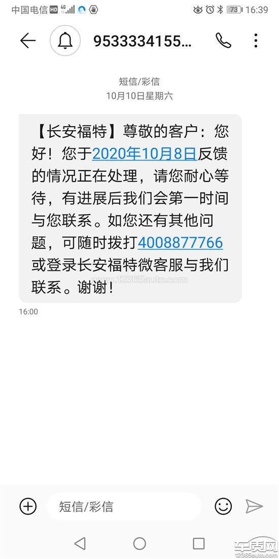 长安福特厂家回复:尊敬的客户您好,您反馈的问题长安福特已经收到,并已协调您车辆所在地的经销商积极处理,同时我们也将密切跟进处理过程。为更快速跟进和解决您的车辆问题,后期您可以直接拨打长安福特客户服务热线400-8877766,谢谢。